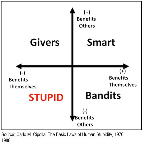 This draws on the concept of Cipollo and his Law of Human Stupidity.