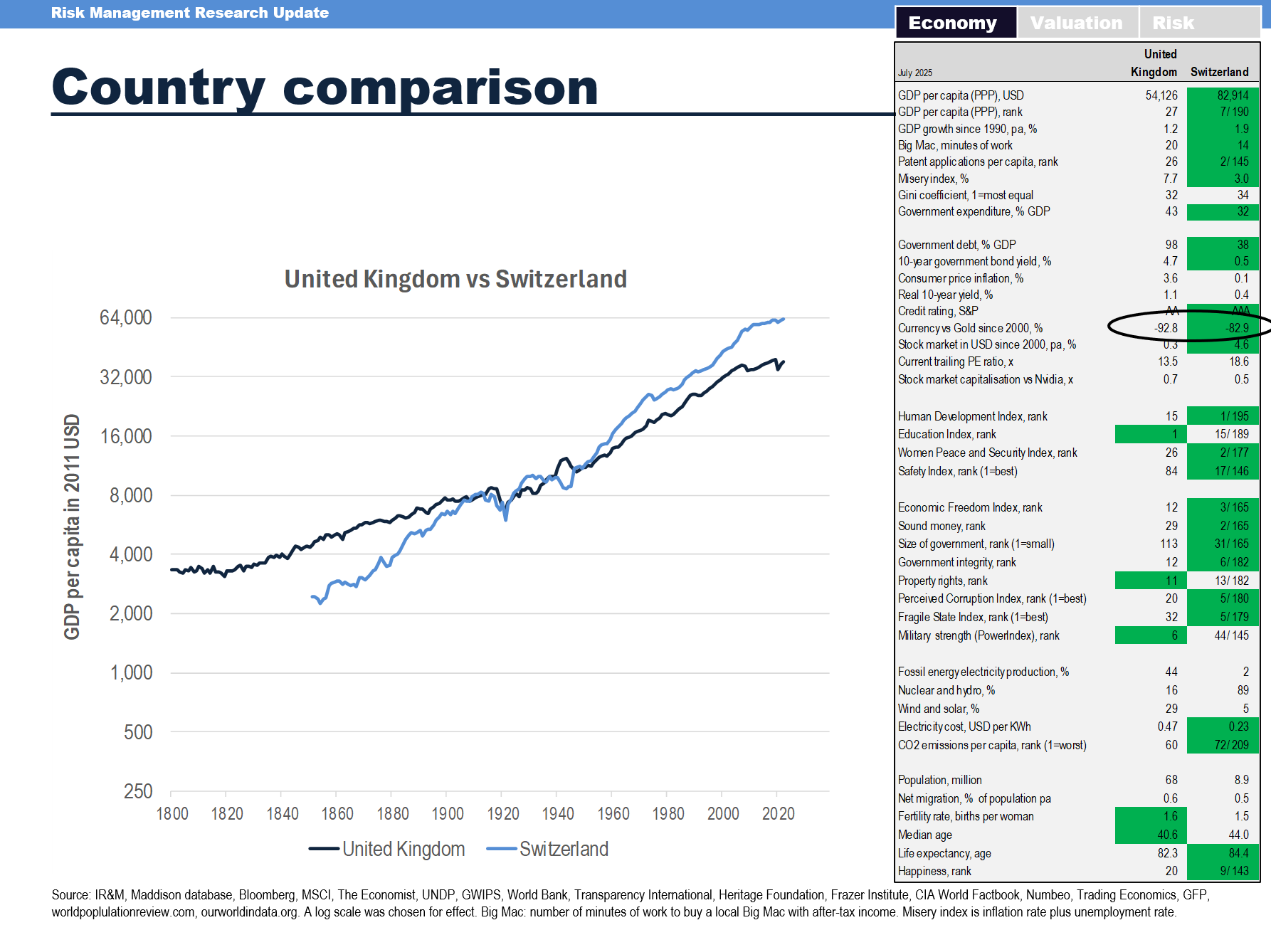 Libertarians and gold bugs often argue, it seems to this author, that all government is corrupt and all taxation is theft. However, that is not very subtle. There are differences worth pointing out. Below is a comparison between the UK and Switzerland. In this series, Switzerland is like a benchmark, not because of the handsomeness of its independent financial analysts domiciled in central Switzerland, but because of its freedom-hugging low propensity to tyranny. In 1971, it took CHF10 to buy GBP1. Now it takes only CHF1.1. The governmental “rip-off” was more extreme in the UK, when compared to Switzerland. Albeit, we do not use the word “tyranny” for mildly elevated and/or persistent inflation. At level 1, the “tyranny” is subtle.