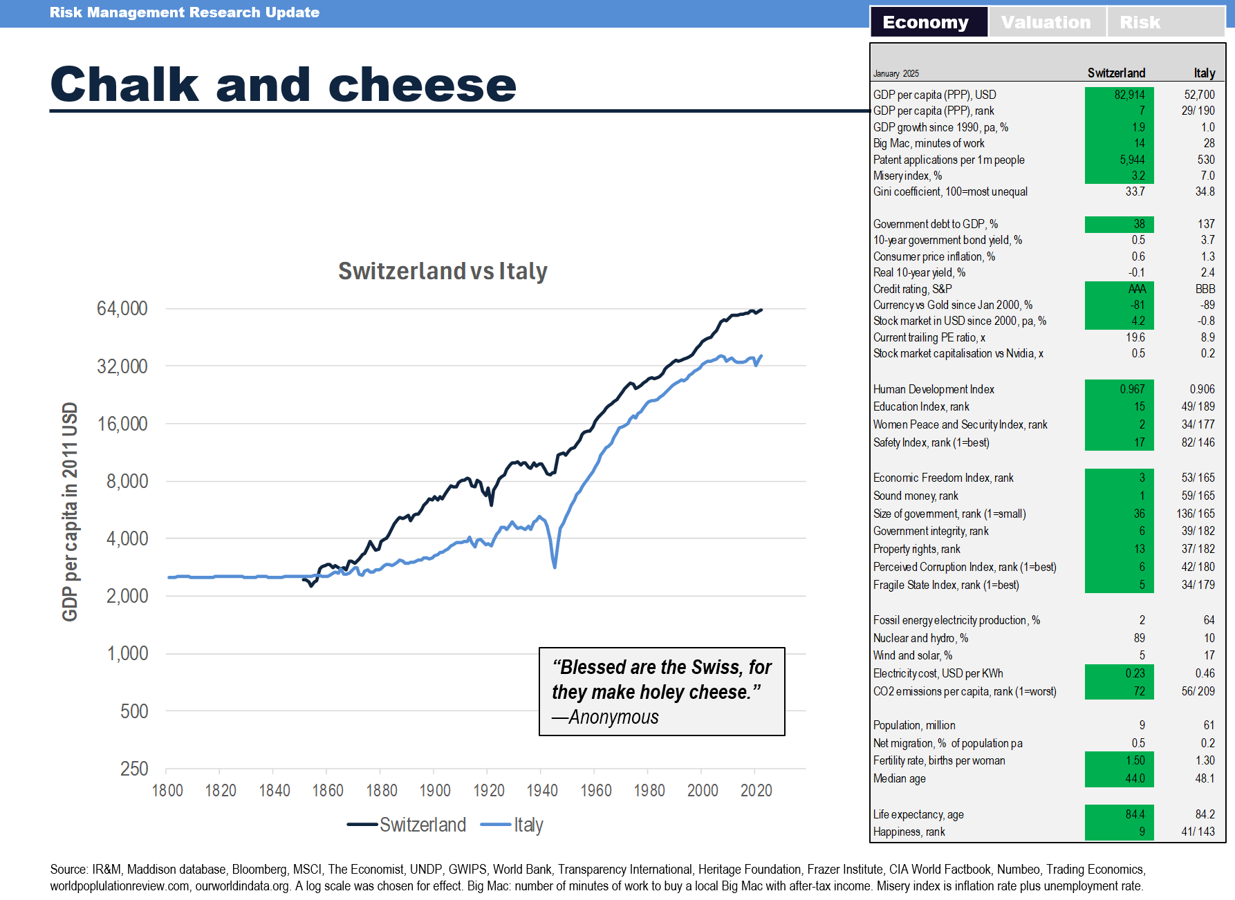 Critics argue that Switzerland’s role as a tax haven and refuge for global wealth is exploitative, undermining efforts to achieve global equity. However, this perspective overlooks a fundamental truth: wealth is not created by governments but by individuals. When governments stifle that creation through incompetence or coercion, the blame lies not with Switzerland but with the systems that drive wealth away in the first place. The Swiss, as my wife attests at every opportunity that arises, are not smarter than anyone else, but, still, the Swiss are stupitees: